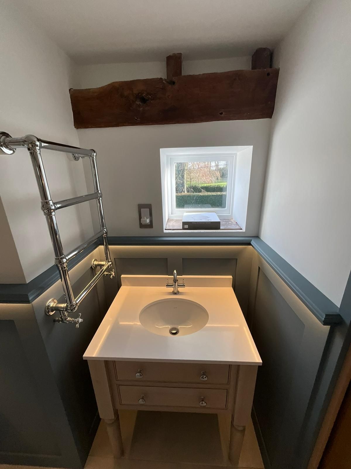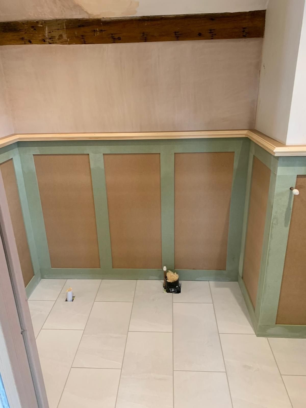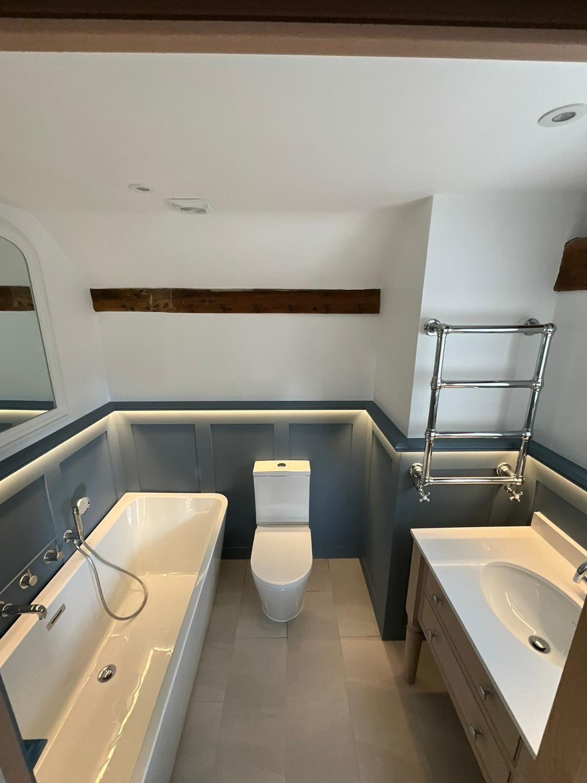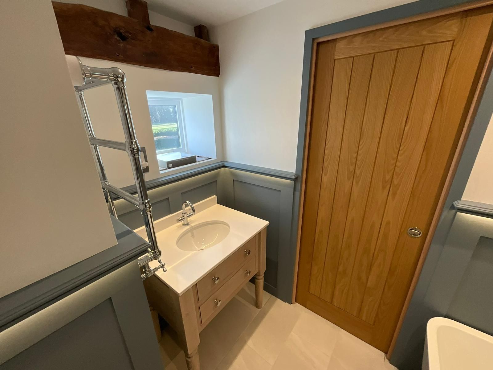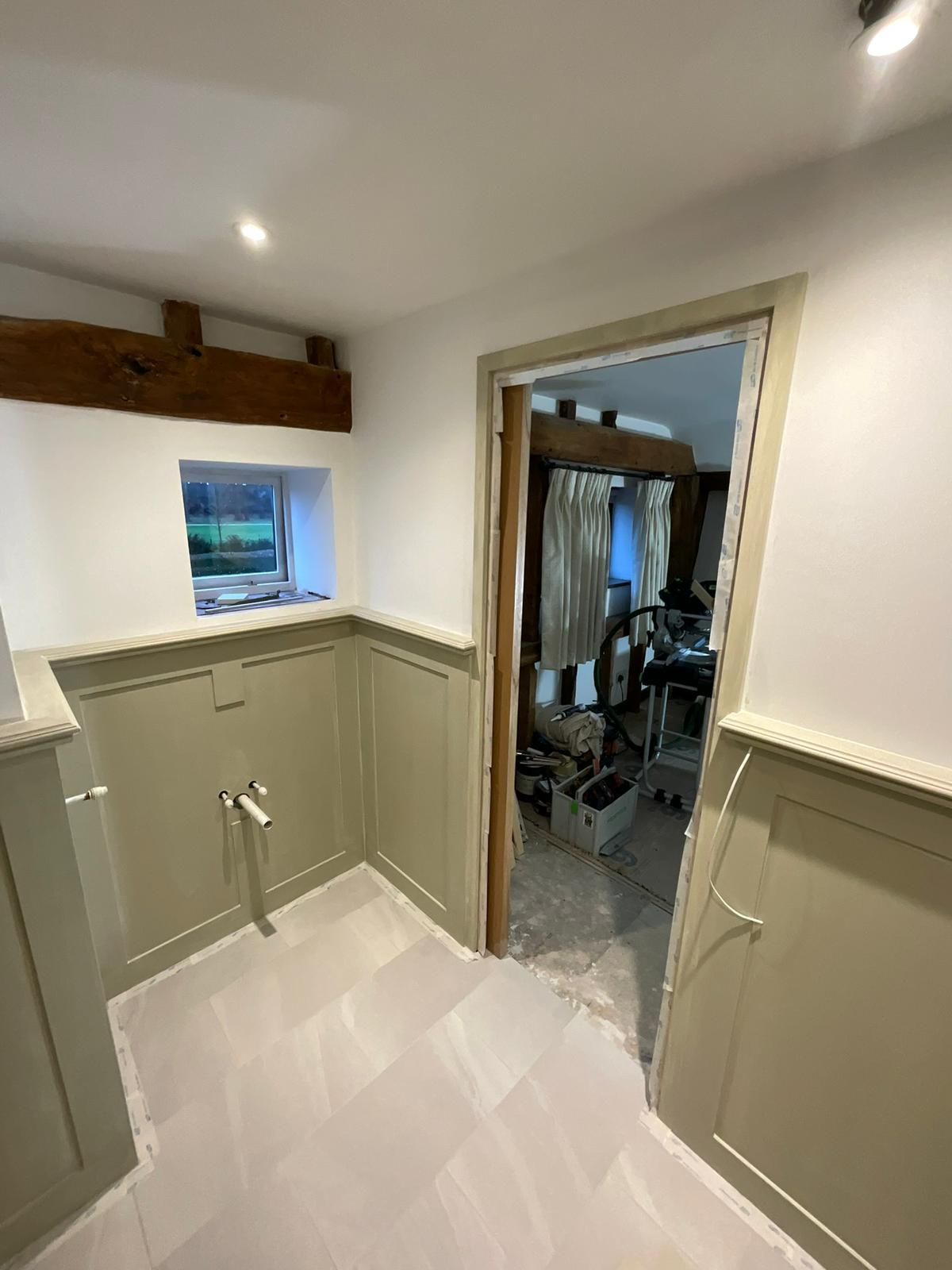 The space was expanded through innovative design, featuring a sliding pocket door that maximizes functionality while adding a touch of modern elegance. The project involved an overhaul of pipework and electrics, ensuring aesthetic appeal and functionality. The floor features premium porcelain tiles that enhance the space and moisture-resistant MDF panelling. The en suite was plastered and decorated in Farrow and Ball paint to complete the look.