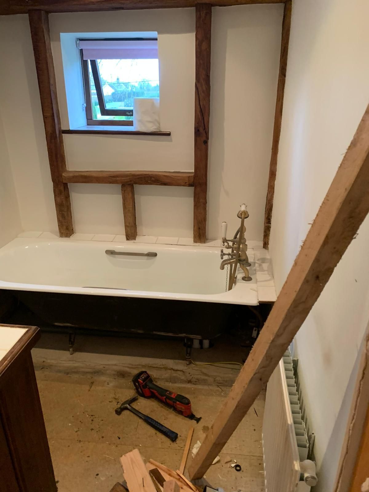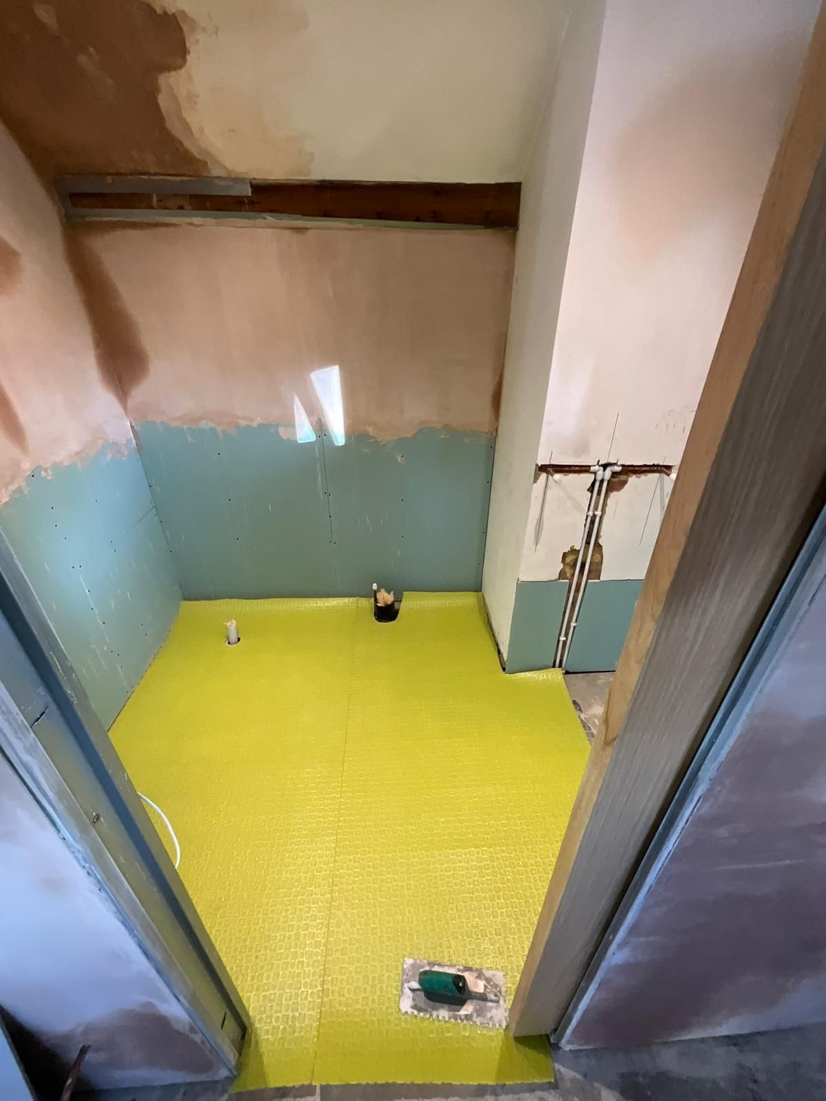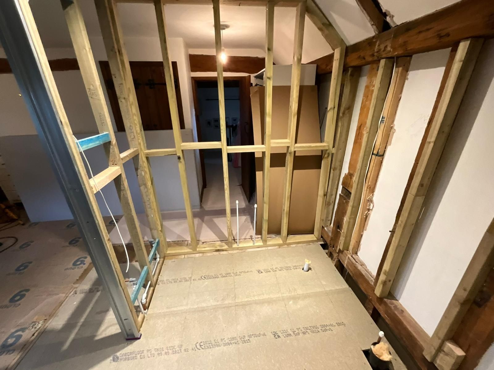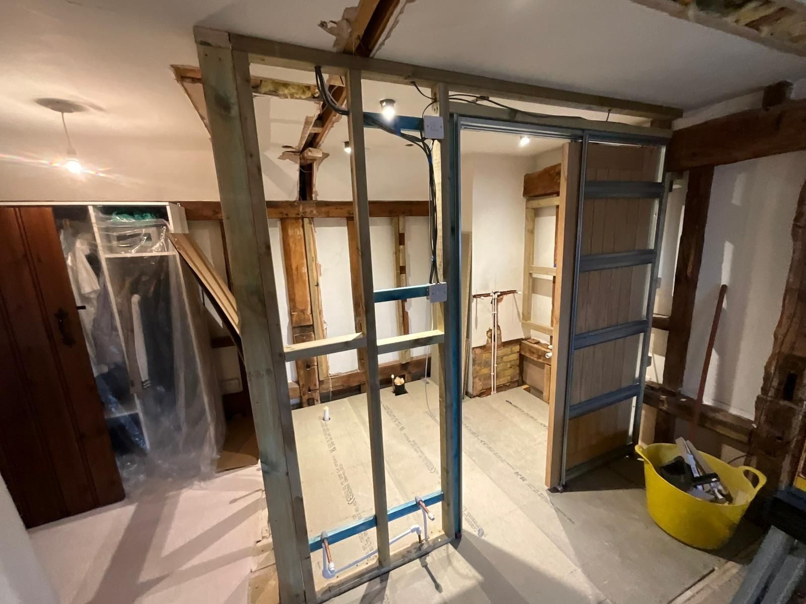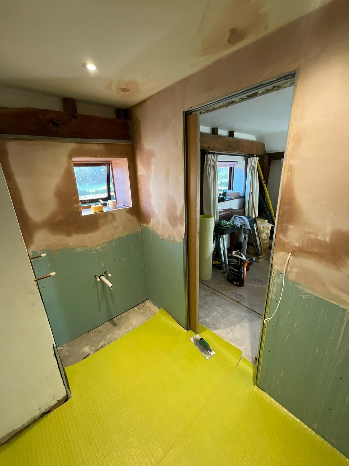 The space was expanded through innovative design, featuring a sliding pocket door that maximizes functionality while adding a touch of modern elegance. The project involved an overhaul of pipework and electrics, ensuring aesthetic appeal and functionality. The floor features premium porcelain tiles that enhance the space and moisture-resistant MDF panelling. The en suite was plastered and decorated in Farrow and Ball paint to complete the look.